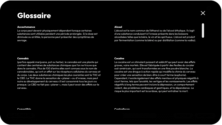 Ce programme porte sur trois substances spécifiques : le cannabis, l’alcool et les opioïdes. Il informe aussi sur les dangers du mélange de substances ou de leur consommation simultanée.