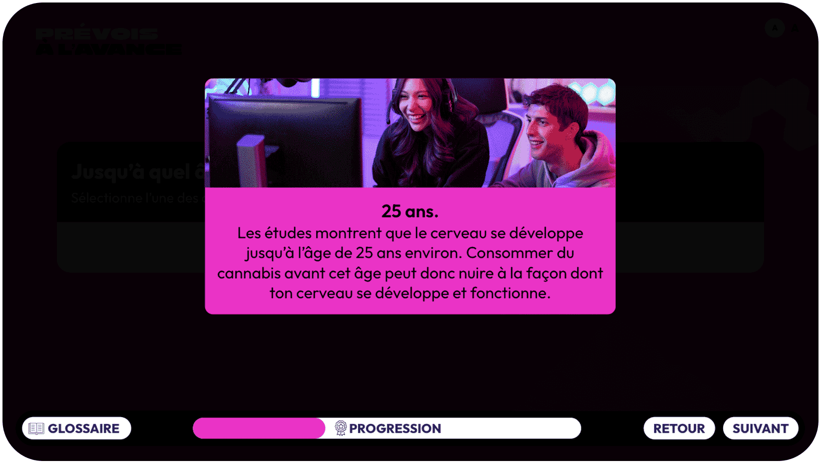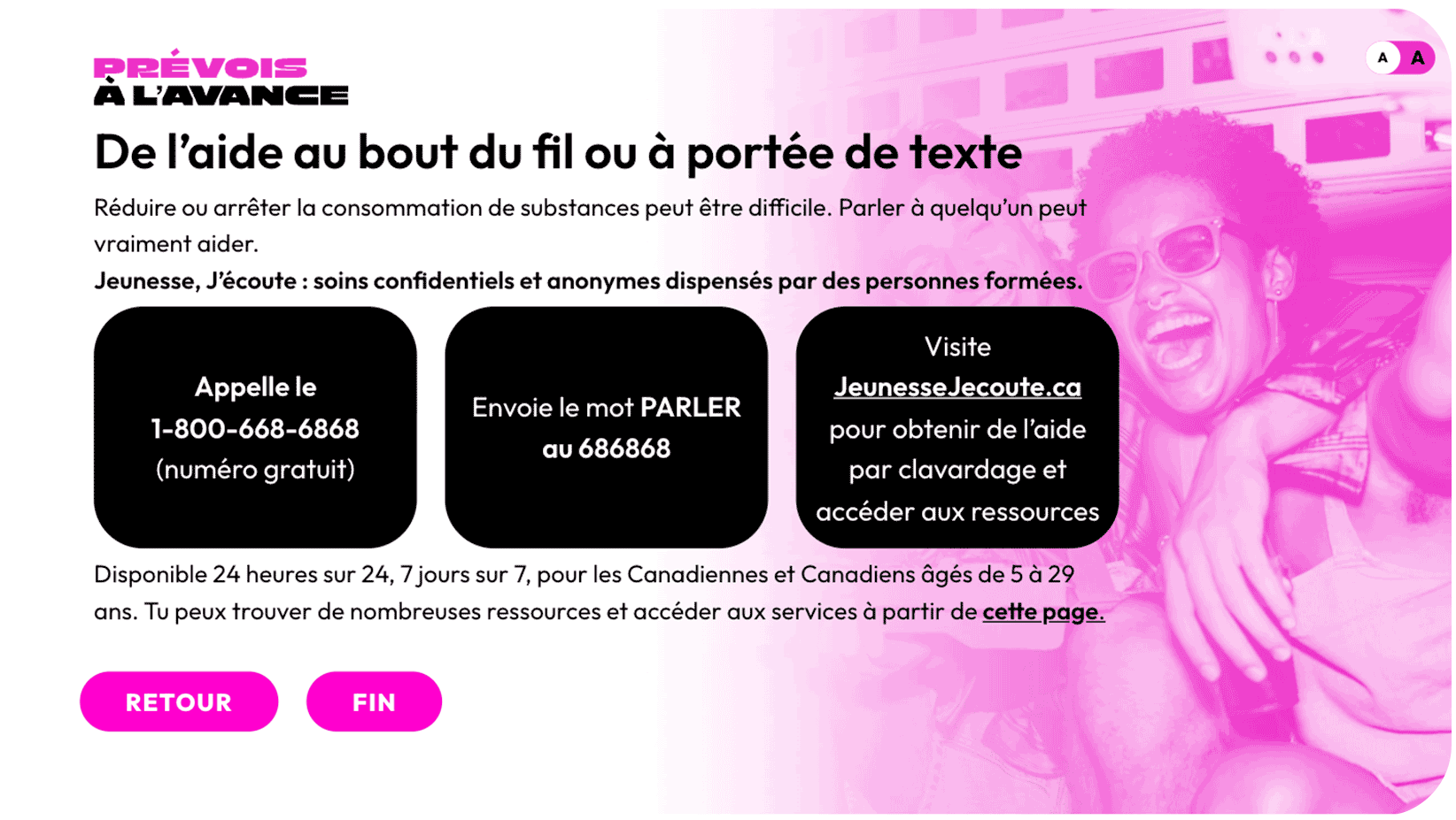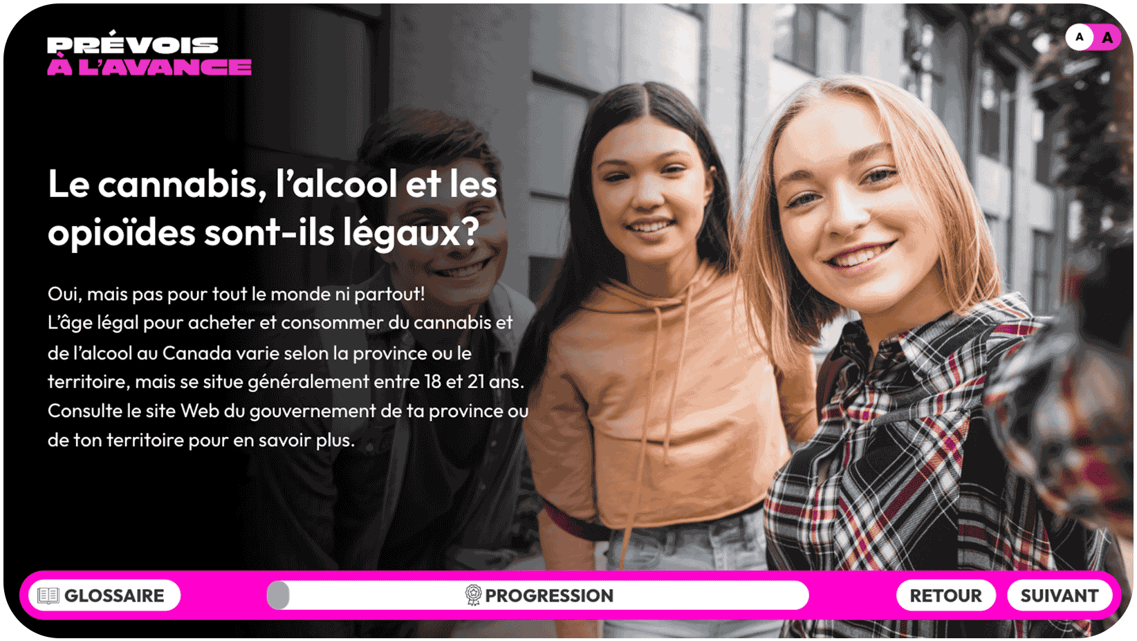 Prévois à l’avance : connais les risques liés à la consommation de substances Il s’agit d’un programme lancé par Santé Canada pour parler des risques liés à la consommation de substances et aider les jeunes à prendre des décisions éclairées.