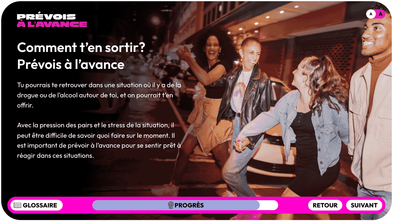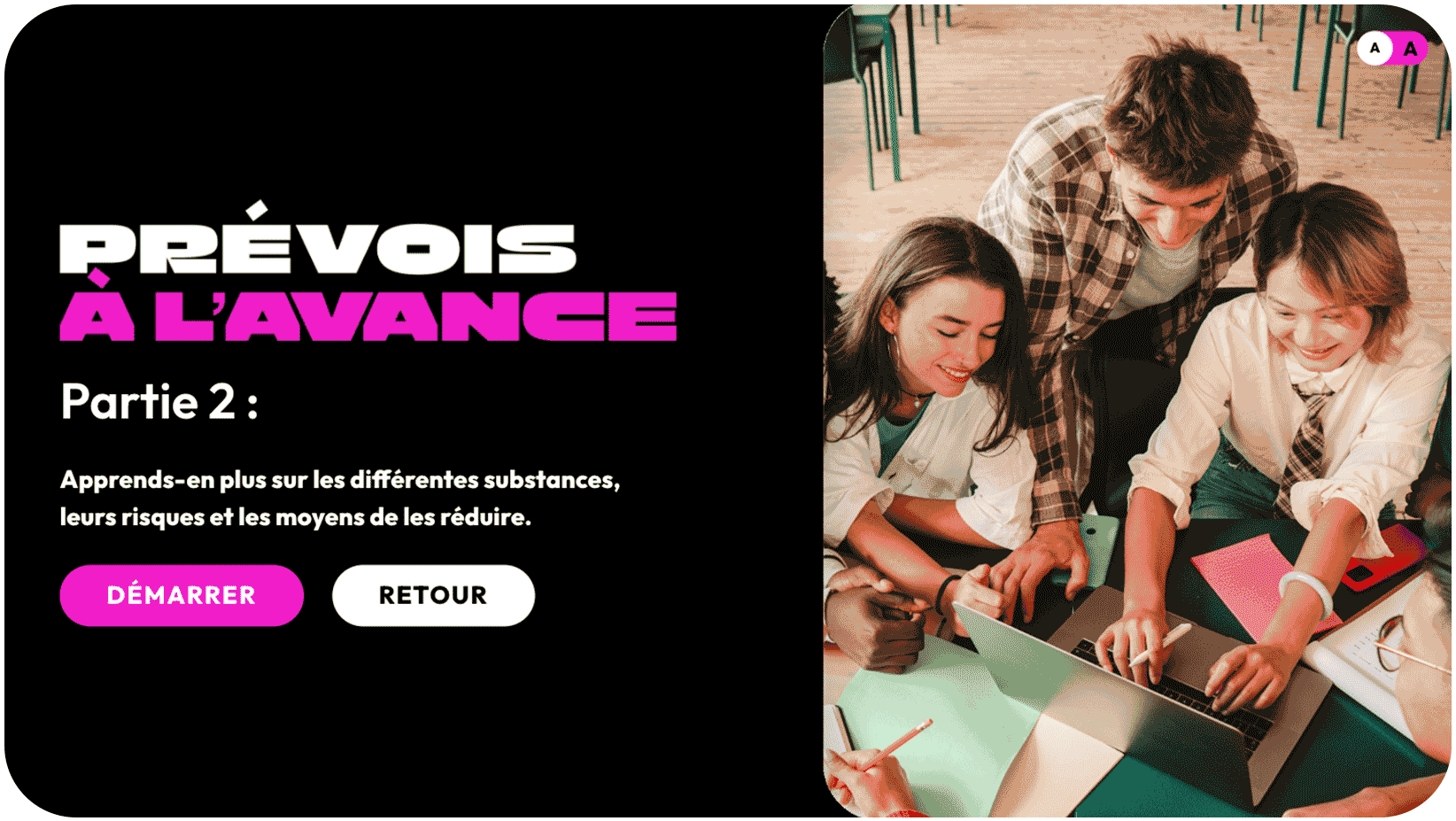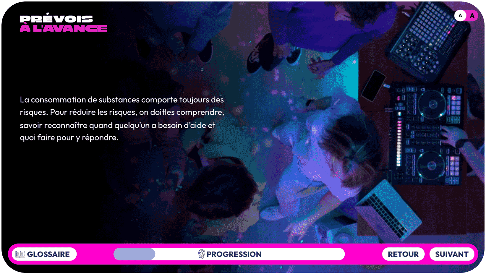- Les diapositives « Prévois à l’avance : connais les risques liés à la consommation de substances » sont prêtes et visibles par les élèves
