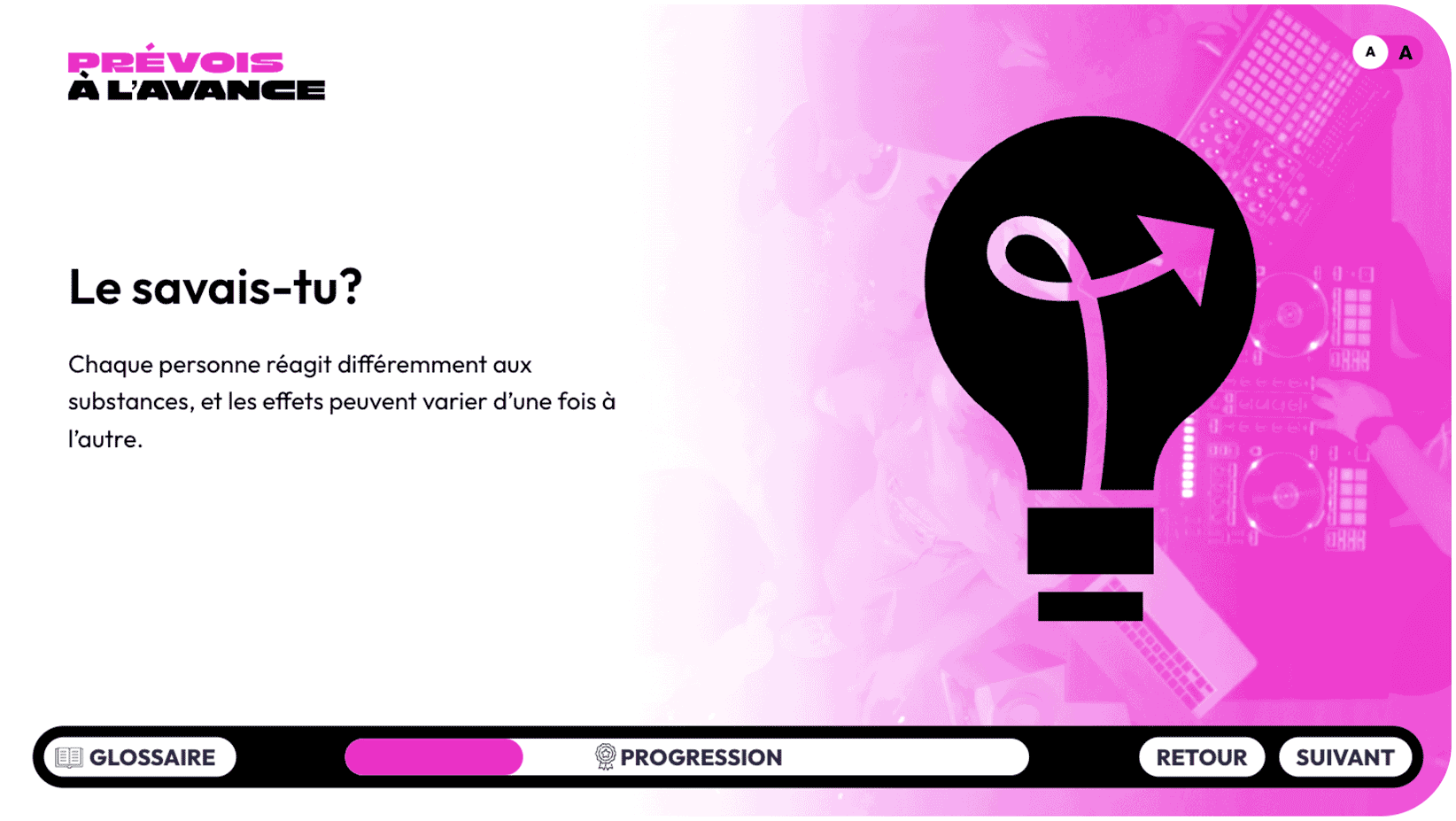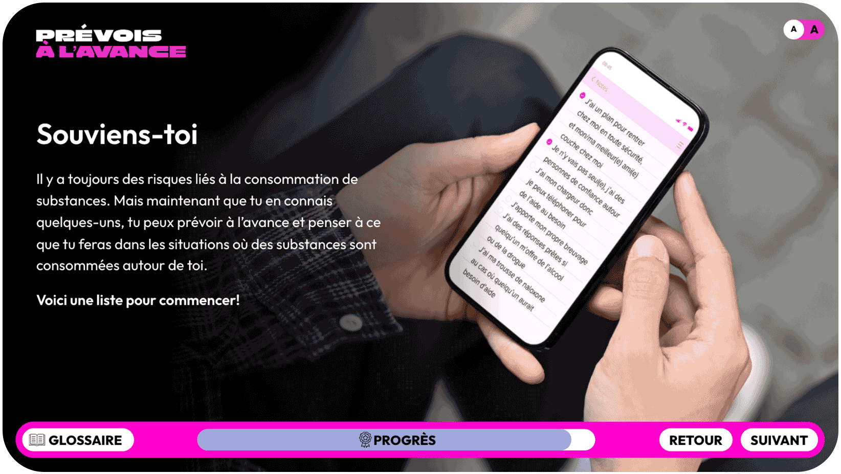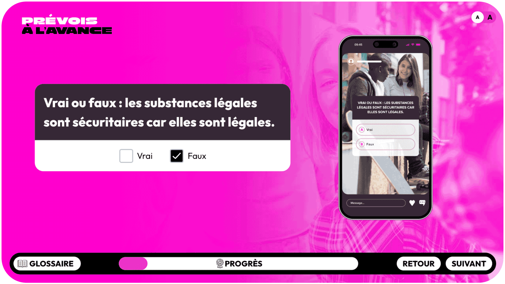 - Les diapositives « Prévois à l’avance : connais les risques liés à la consommation de substances » sont prêtes et visibles par les élèves