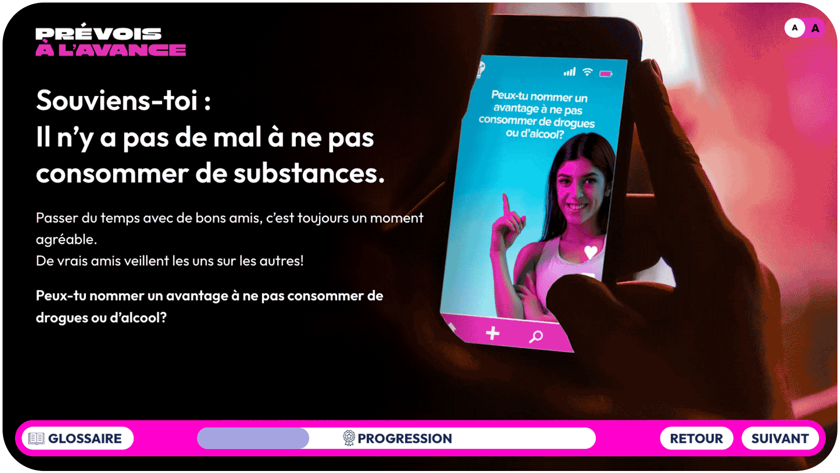 Regardons les suggestions à l’écran pour découvrir les bienfaits qui peuvent se produire lorsqu’on ne consommez pas de substances.