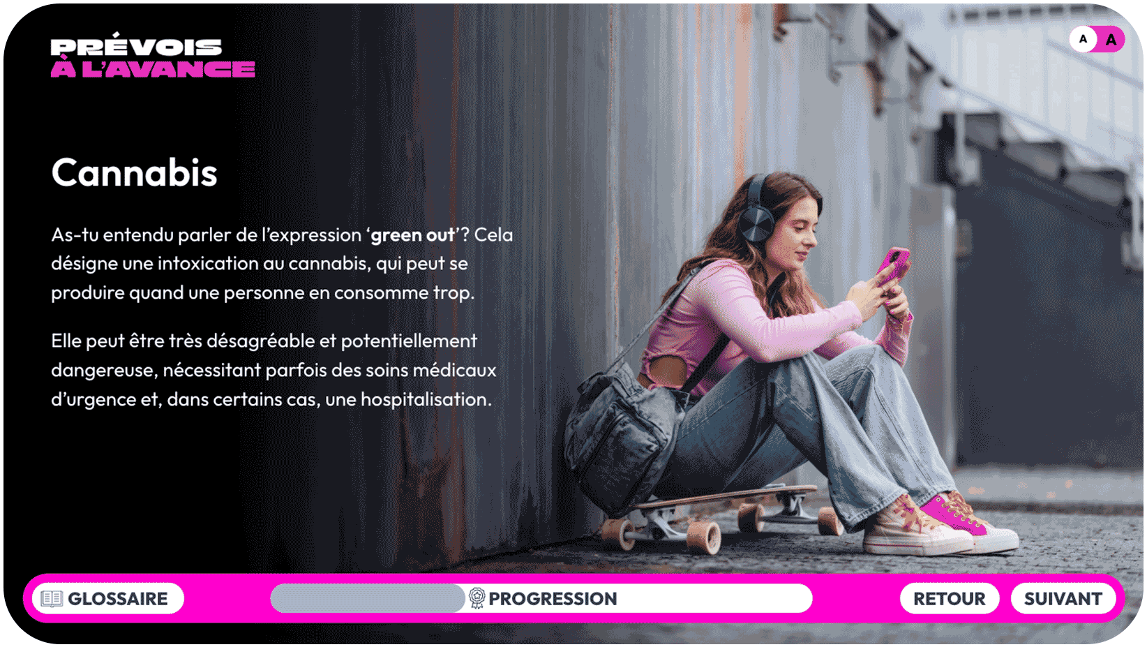 Vous pouvez en savoir plus sur les risques liés à la consommation de cannabis en consultant la page dont le lien figure à l’écran.