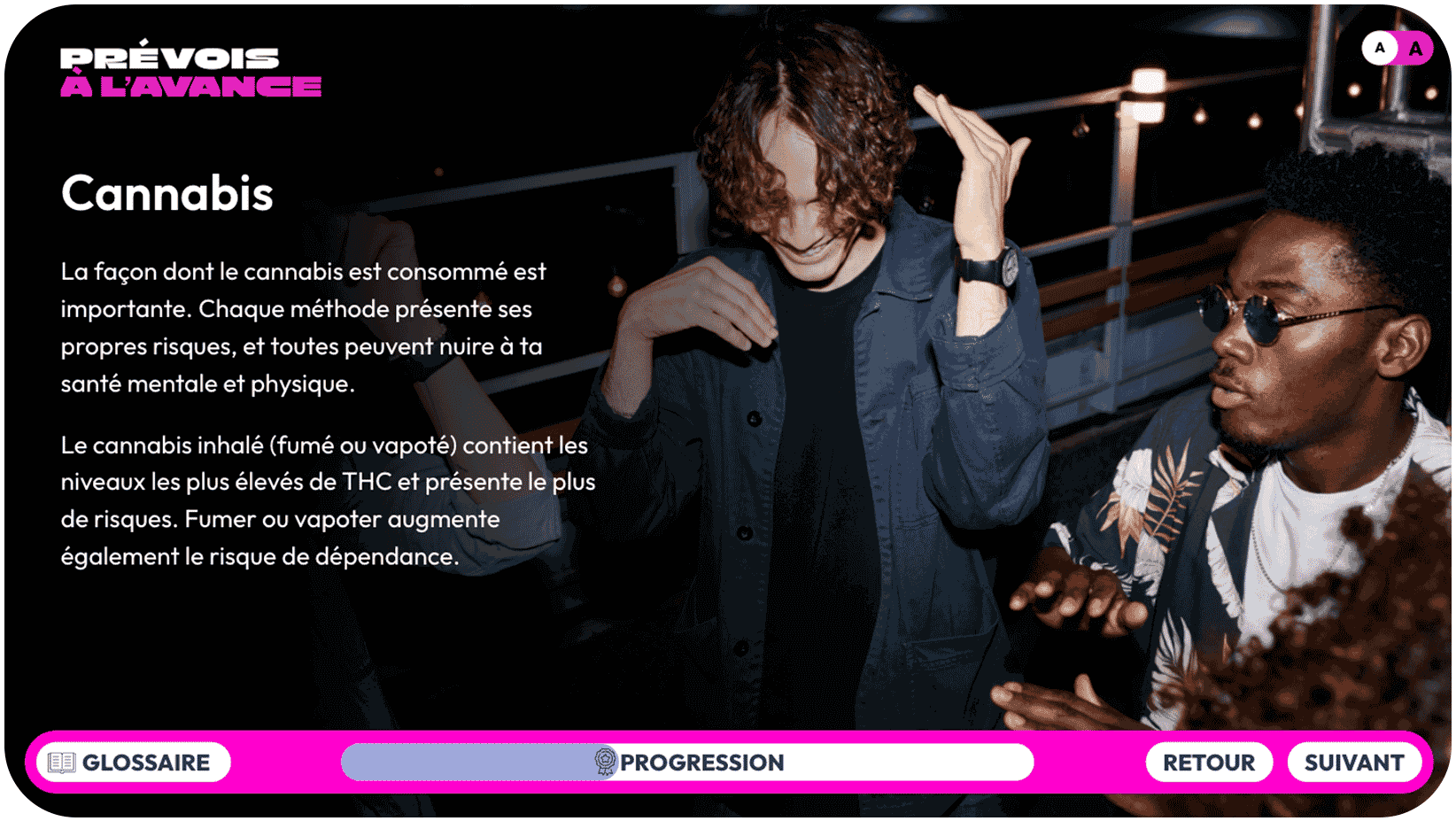 Apprenons-en un peu plus sur le cannabis et les risques associés aux différentes méthodes de consommation. Jetez un coup d’œil aux informations affichées à l’écran.