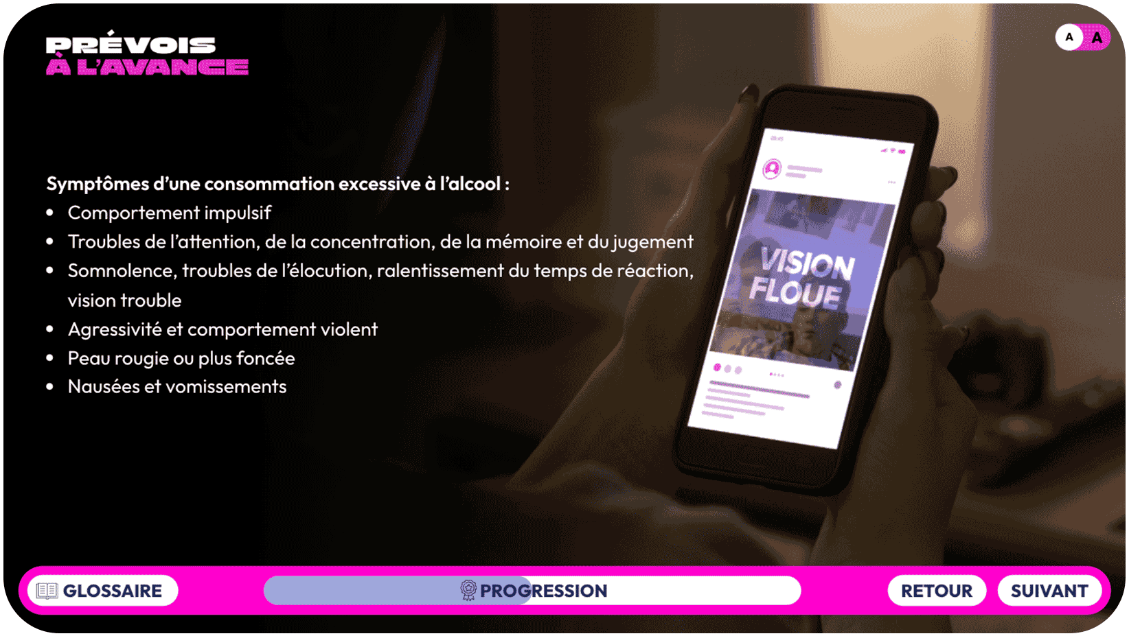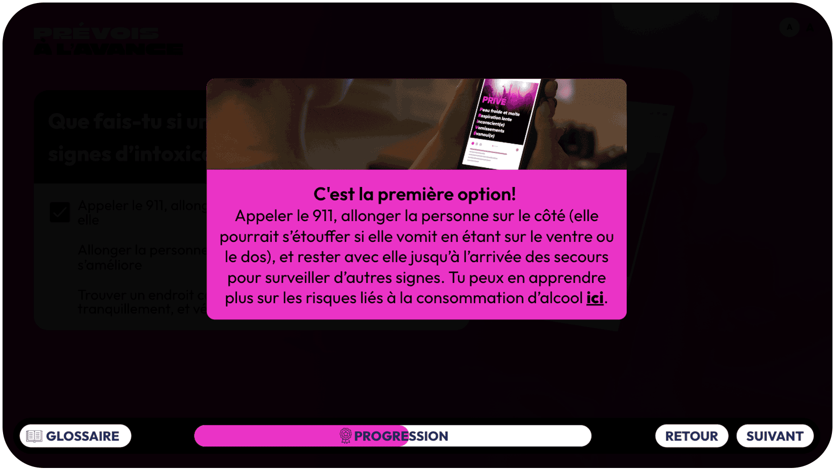 Vous pouvez en savoir plus sur les risques liés à la consommation d’alcool en consultant la page dont le lien figure à l’écran.