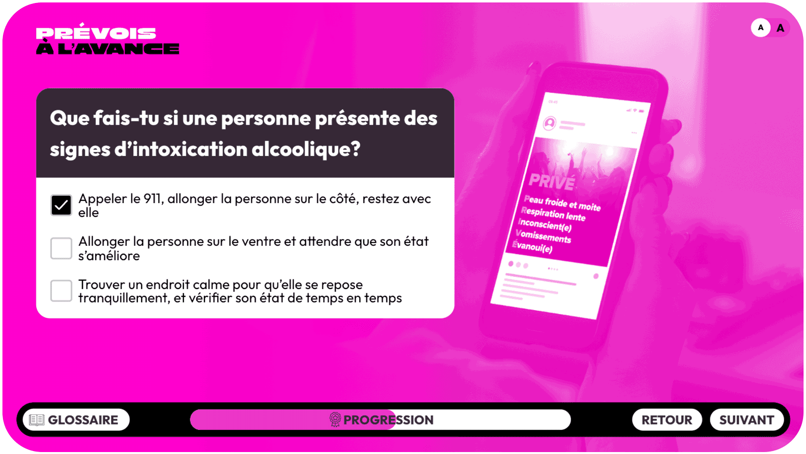 C’est la première option! Si vous voyez quelqu’un qui présente des signes d’intoxication alcoolique, appelez le 911, allongez la personne sur le côté et restez avec elle jusqu’à l’arrivée des secours.