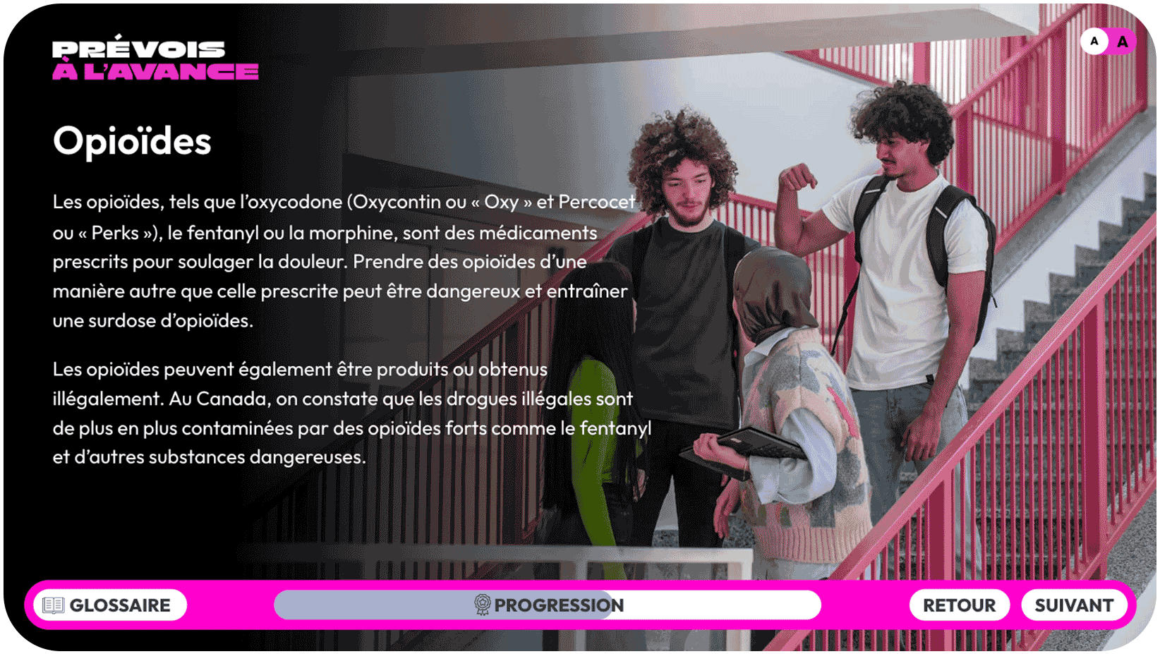 Les sujets abordés couvrent la crise des opioïdes au Canada, les signes de surdose et l’utilisation de la naloxone. Si vous ne connaissez pas cette substance, nous vous recommandons de consulter les ressources ci-dessous. Il y a aussi une section FAQ ci-dessous pour vous aider à répondre aux questions que les élèves pourraient avoir.