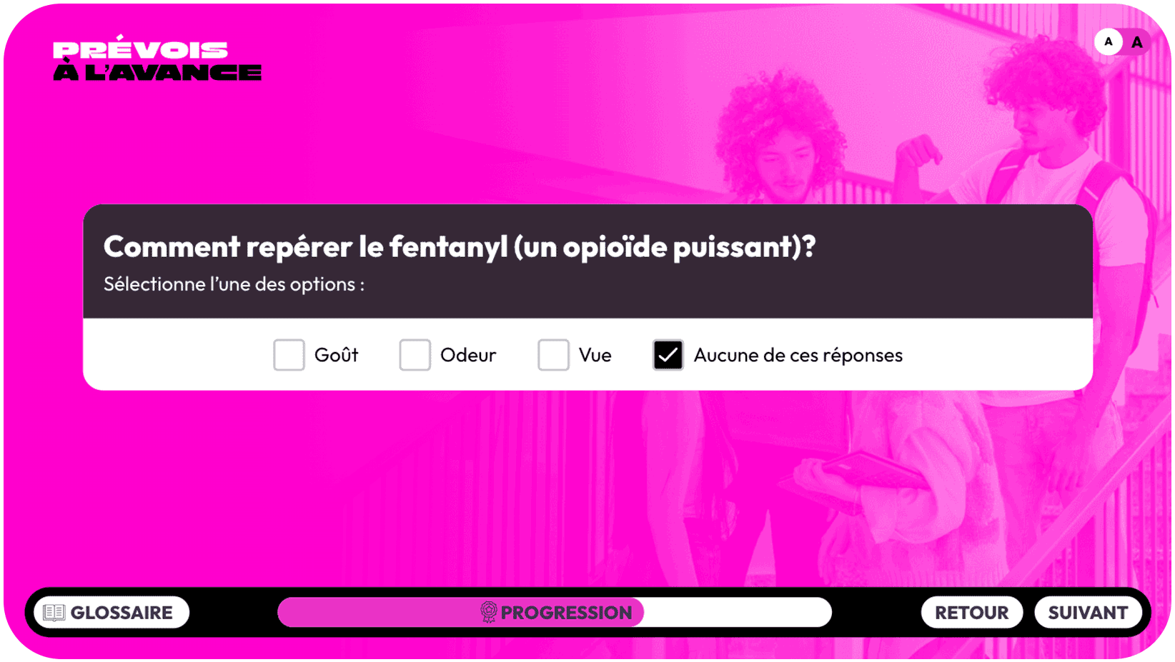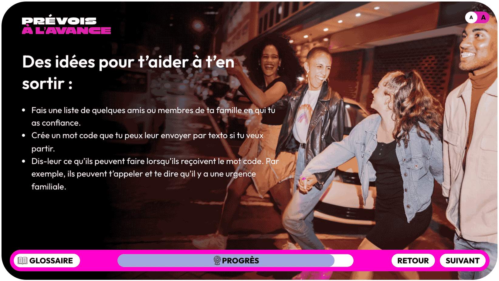 En suivant les différentes étapes du guide, vous pouvez développer votre propre séance d’information « Prévois à l’avance : connais les risques liés à la consommation de substances » pour transmettre des informations factuelles, mener des activités qui font réfléchir et encourager les jeunes à se protéger et à protéger leur entourage.