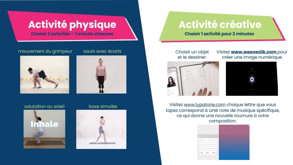 - Ressources disponibles : utilisez ce que vous avez (par exemple de l’équipement sportif, des fournitures d’art.)