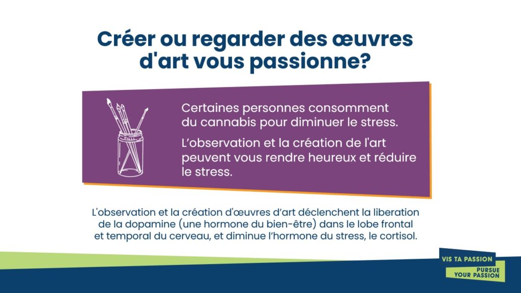 En suivant les étapes suivantes, vous pouvez créer votre propre leçon « Vis ta passion » pour fournir des informations factuelles, diriger des activités qui font réfléchir et encourager les participants à vivre une passion sans avoir recours au cannabis. Il y a plusieurs raisons pour lesquelles les jeunes décident de consommer du cannabis : se détendre, diminuer leur stress et anxiété, s’amuser, expérimenter, pour agir comme leurs amis ou juste pour essayer quelque chose de nouveau. Certains jeunes le perçoivent comme un produit naturel et le jugent donc sécuritaire. Il existe des manières d’approcher les adolescents qui favorisent une communication ouverte et positive.