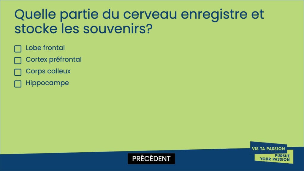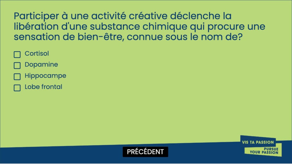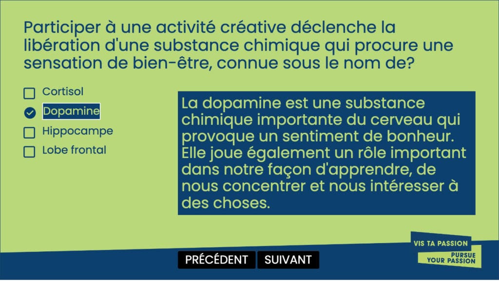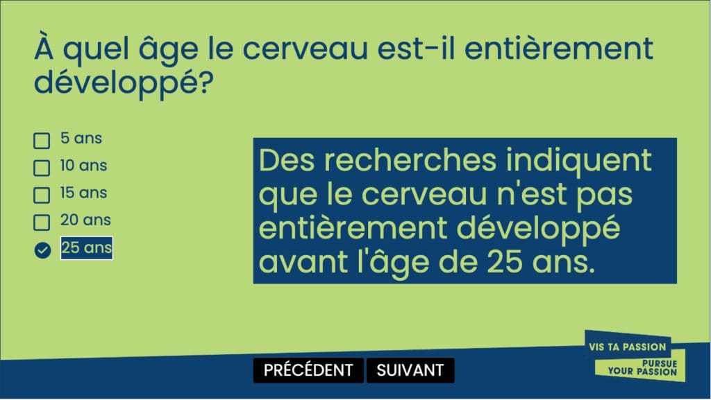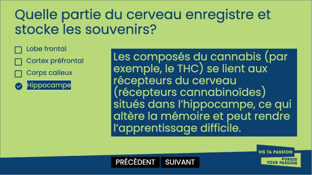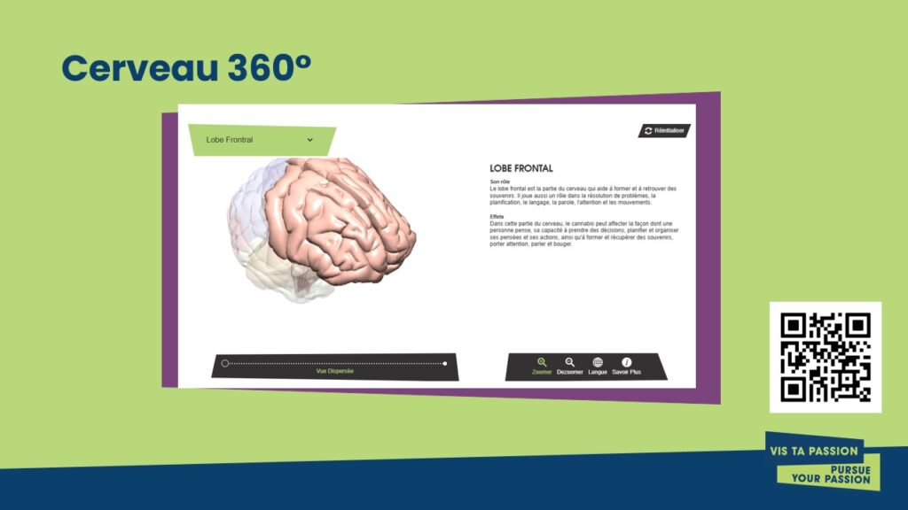 Les composés du cannabis agissent sur le même mécanisme biologique responsable du développement du cerveau. Au cours de l’expérience Vis ta passion, les participants apprennent comment le cannabis affecte chaque zone de cet organe vital et ce qui pourrait éventuellement se produire à long terme. Avec l’application de l’outil éducatif Cerveau 360°, les participants pourront consulter les différentes parties du cerveau afin de comprendre leurs rôles et l’impact que peut avoir la consommation de cannabis sur ceuxci. Il est important de souligner que la consommation de cannabis fréquente peut avoir un impact significatif sur le cerveau des adolescents, car le cerveau n’est pas entièrement développé avant l’âge de 25 ans environ. Les jeunes sont donc particulièrement vulnérables aux effets du cannabis sur le développement et le fonctionnement du cerveau. Nous encourageons les éducateurs à se familiariser avec la plate-forme avant votre leçon. Dans la leçon, les éducateurs se concentreront sur les zones du cerveau qui affectent la réflexion, la planification et la prise de décision. Conseil pour améliorer l’expérience : Utilisez un projecteur pour montrer l’application Cerveau 360o à plusieurs élèves en même temps.